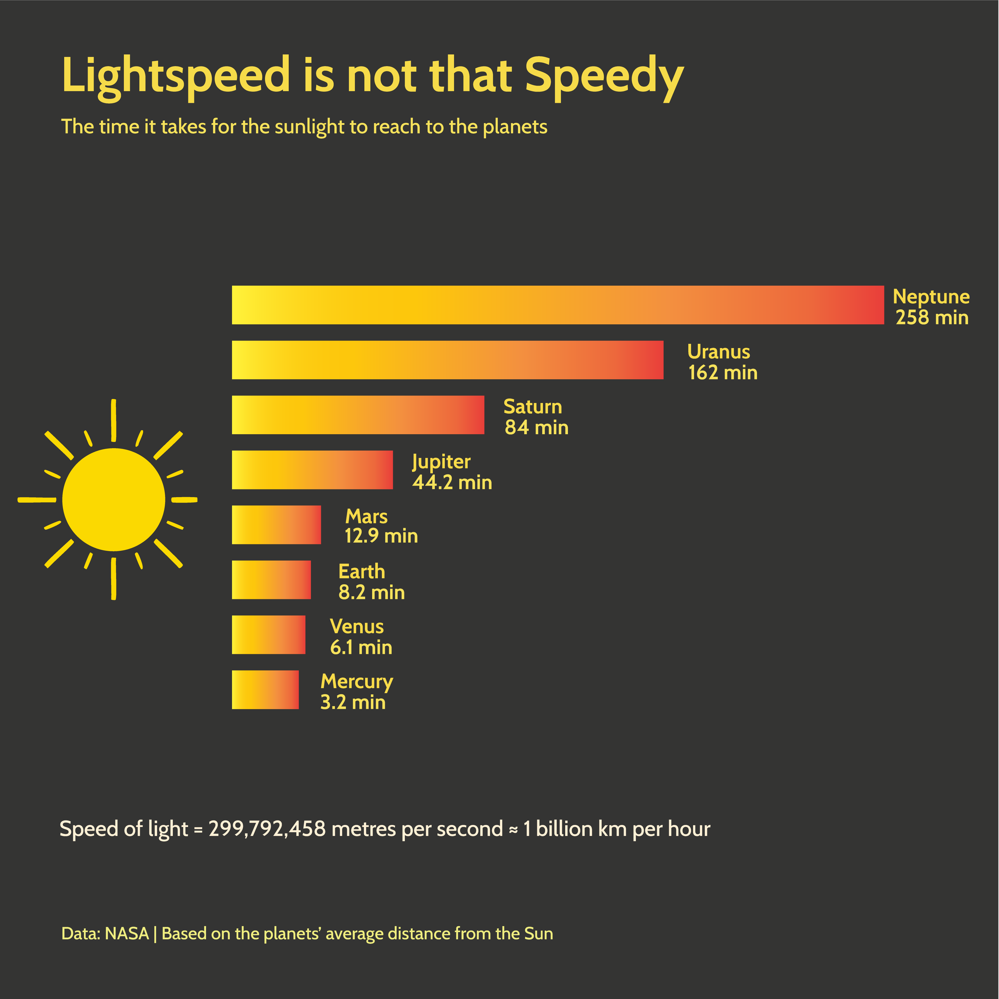 Light travels at the ultimate cosmic speed limit, but distances in space makes even light feel sluggish. A surprising fact: if our Sun disappeared right now, we wouldn’t know for about 8.2 minutes! This chart illustrates how long it takes for the sunlight to reach different planets.