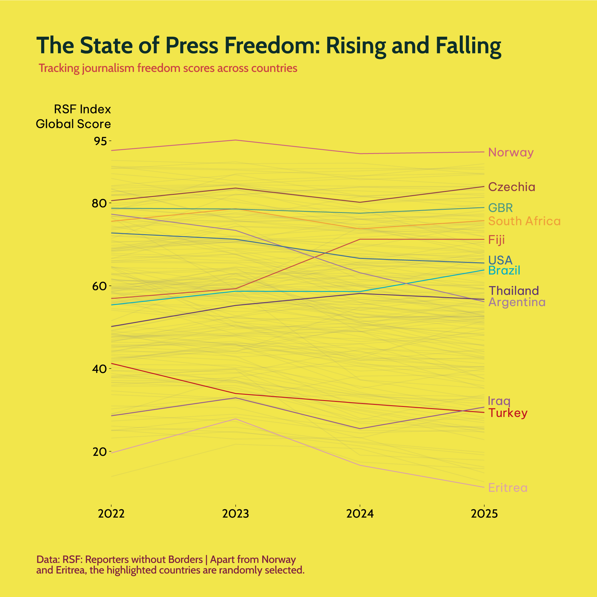 The Reporters without Borders’ (RSF) Global Index is a crucial indicator of the health of a democracy and the fundamental right to information. The RSF updated their methodology for the Index in 2022, comparing the Index scores over the years reveals a striking picture of how freedomg of press shifts across countries year-on-year.