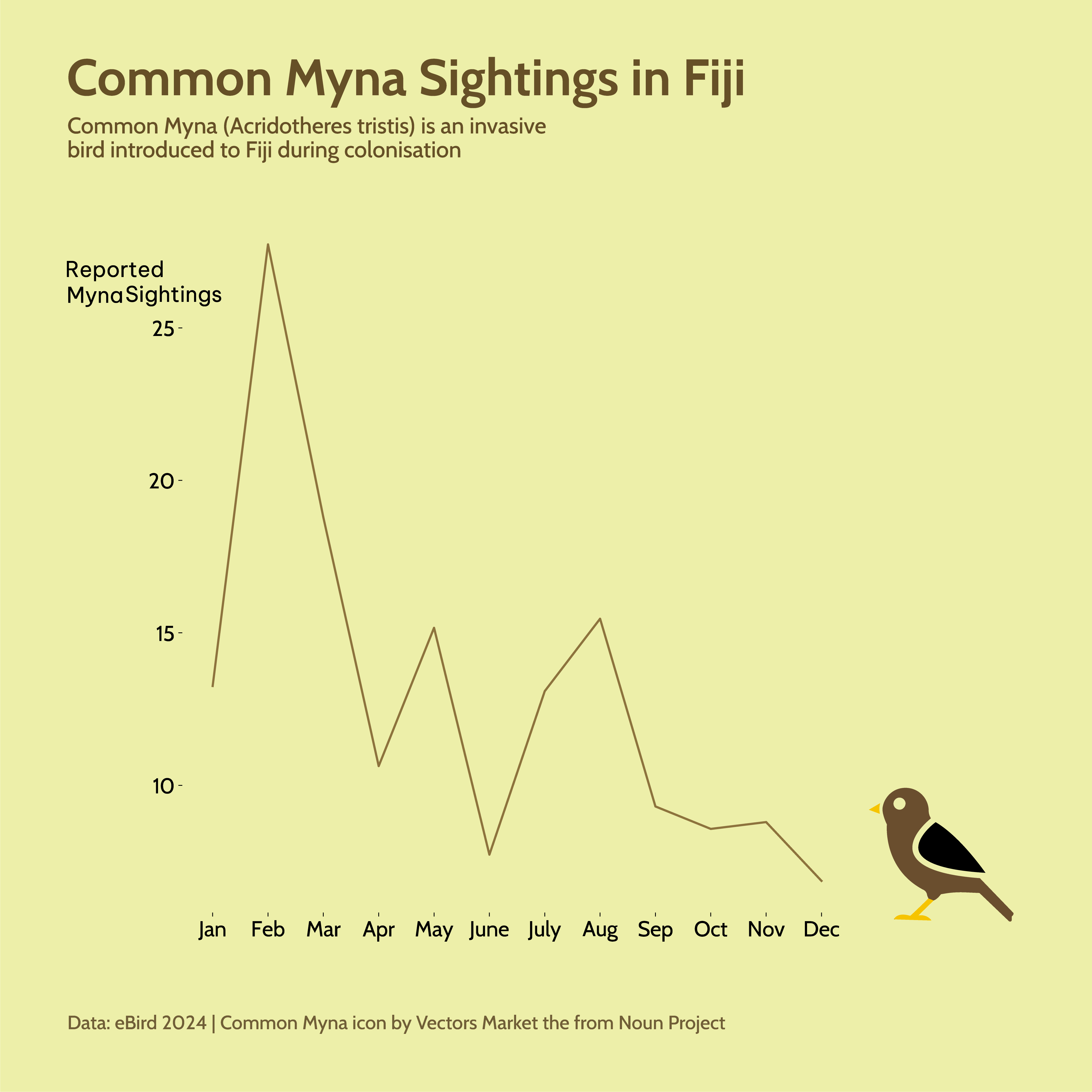 The Common Myna (Acridotheres tristis) is such a frequent bird to see in Fiji, one might think that they are endemic to the islands. However, they are an invasive species introduced during colonisation. This line chart tracks the monthly reported sightings for conservationists, showing how the frequency of reports peaks during the early months of the year.