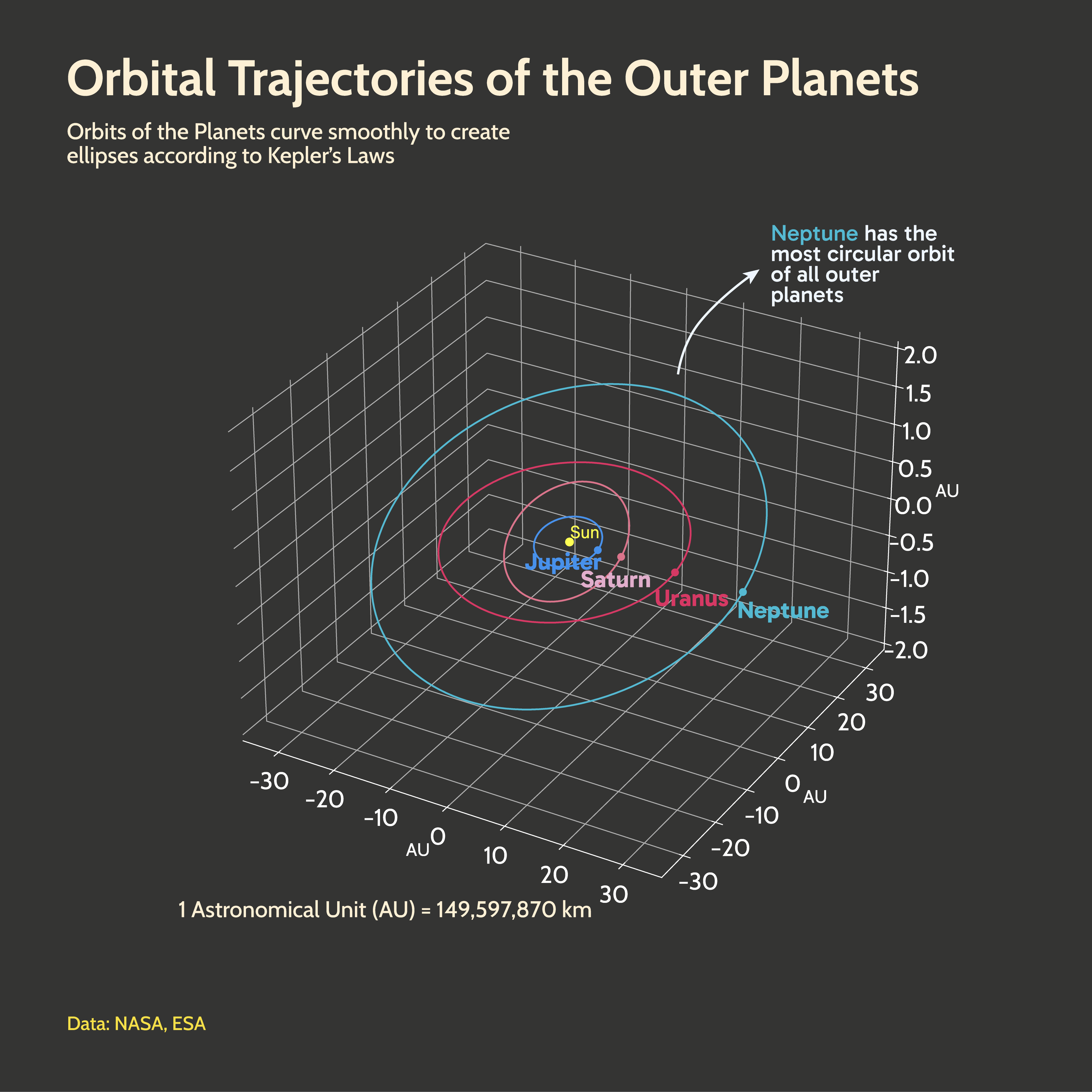 Kepler was right! His three laws of planetary motion were so precise that they didn’t just describe known orbits: they could predict new ones. His work was foundational to the discovery of Uranus, which was discovered using purely mathematical equations before being observed. This 3D visualisation captures the smooth, elliptical orbital trajectories of the outer planets.
