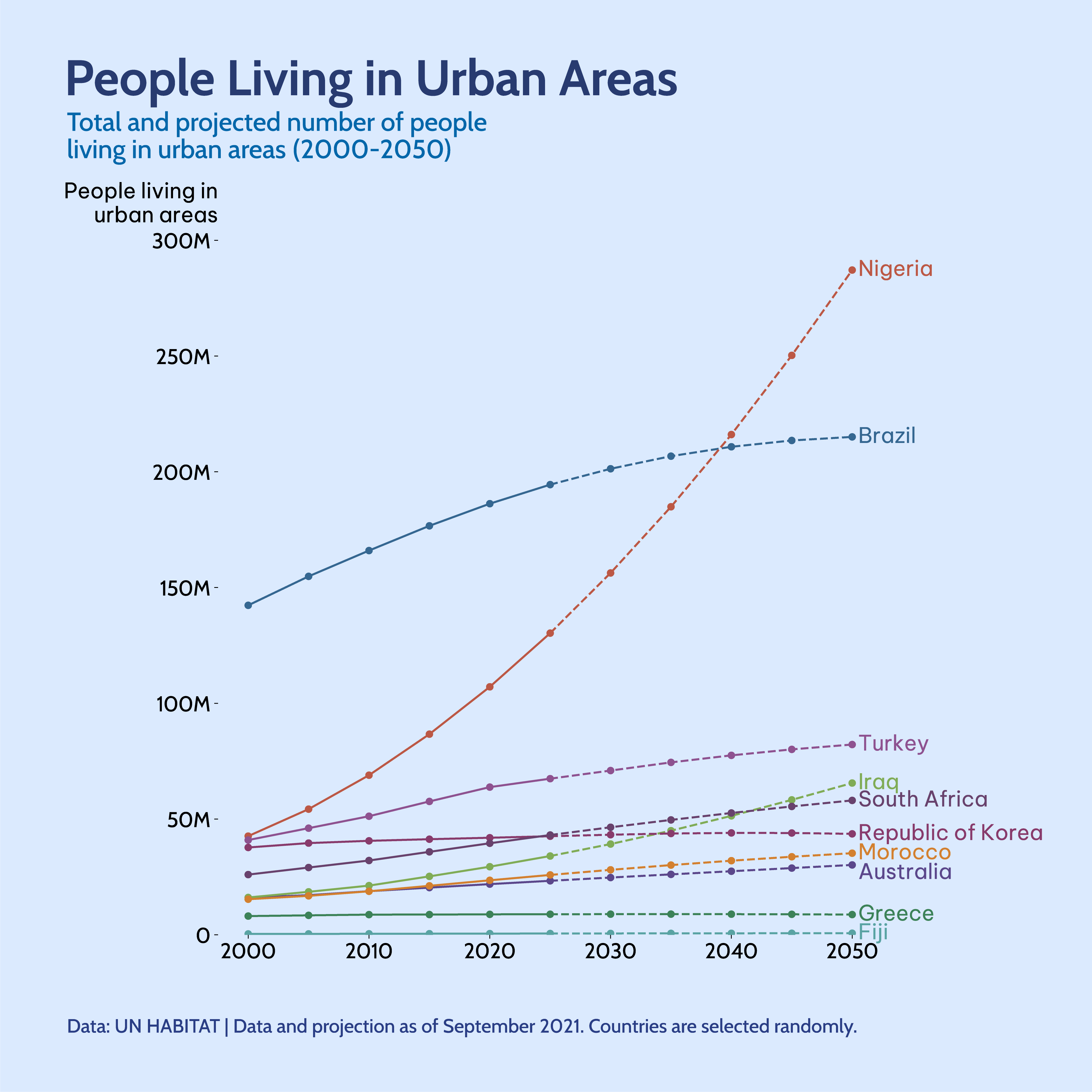 More and more people are choosing to live in urban areas, but this trend varies significantly between countries. While some nations have stabilised their urbanisation rates, others are experiencing a very steep and accelerating shift towards cities. This projection chart captures that massive difference, notably showing Nigeria’s urban population surging past Brazil’s in the coming decades.
