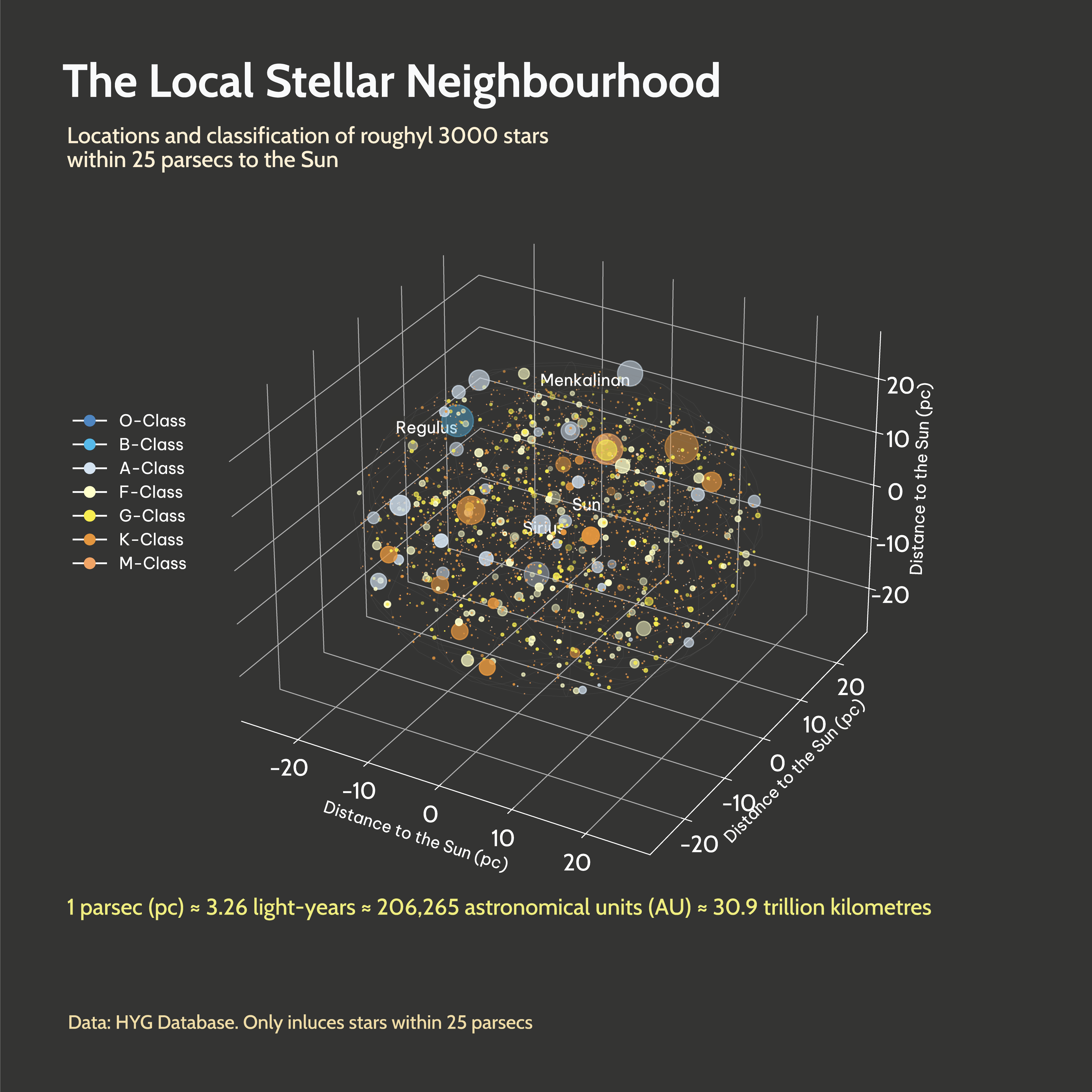 Look up! Our stellar neighbourhood is teeming with stars. Within just 25 parsecs, there are roughly 3,000 confirmed stars. This 3D map shows their locations and spectral classes; a visible manifestation of the Hertzsprung-Russell Diagram, showing that even close to home, the universe is crowded and incredibly difficult to reach.