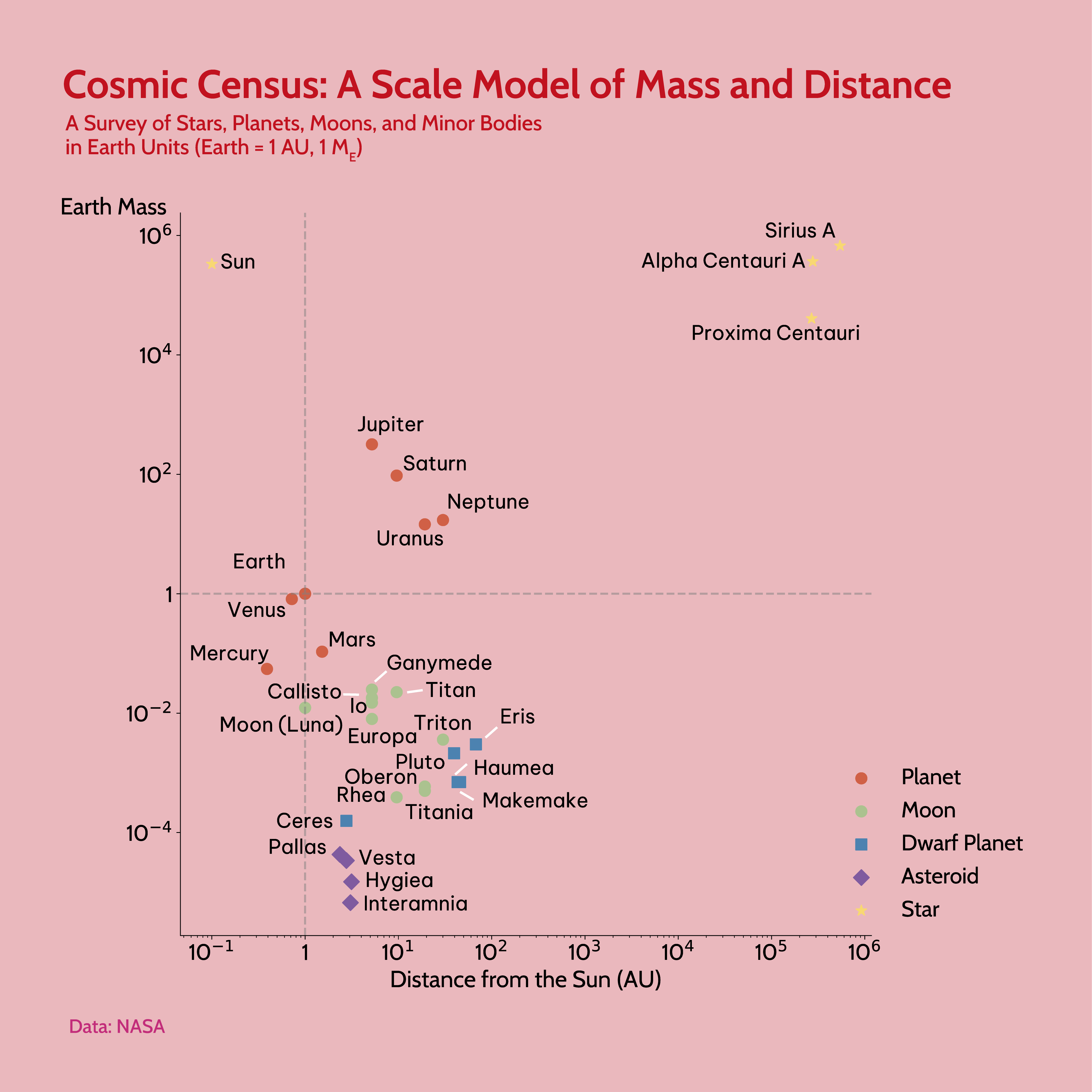 How big and distant are astronomical objects if we use our Earth as the scale? The answer is: too big and too distant for a standard chart! This visualisation uses a logarithmic scale on both axes to compare the mass and distance from the Sun for everything from tiny moons to distant stars, proving that when charting the cosmos, a log scale is (most likely) our only way to maintain perspective.
