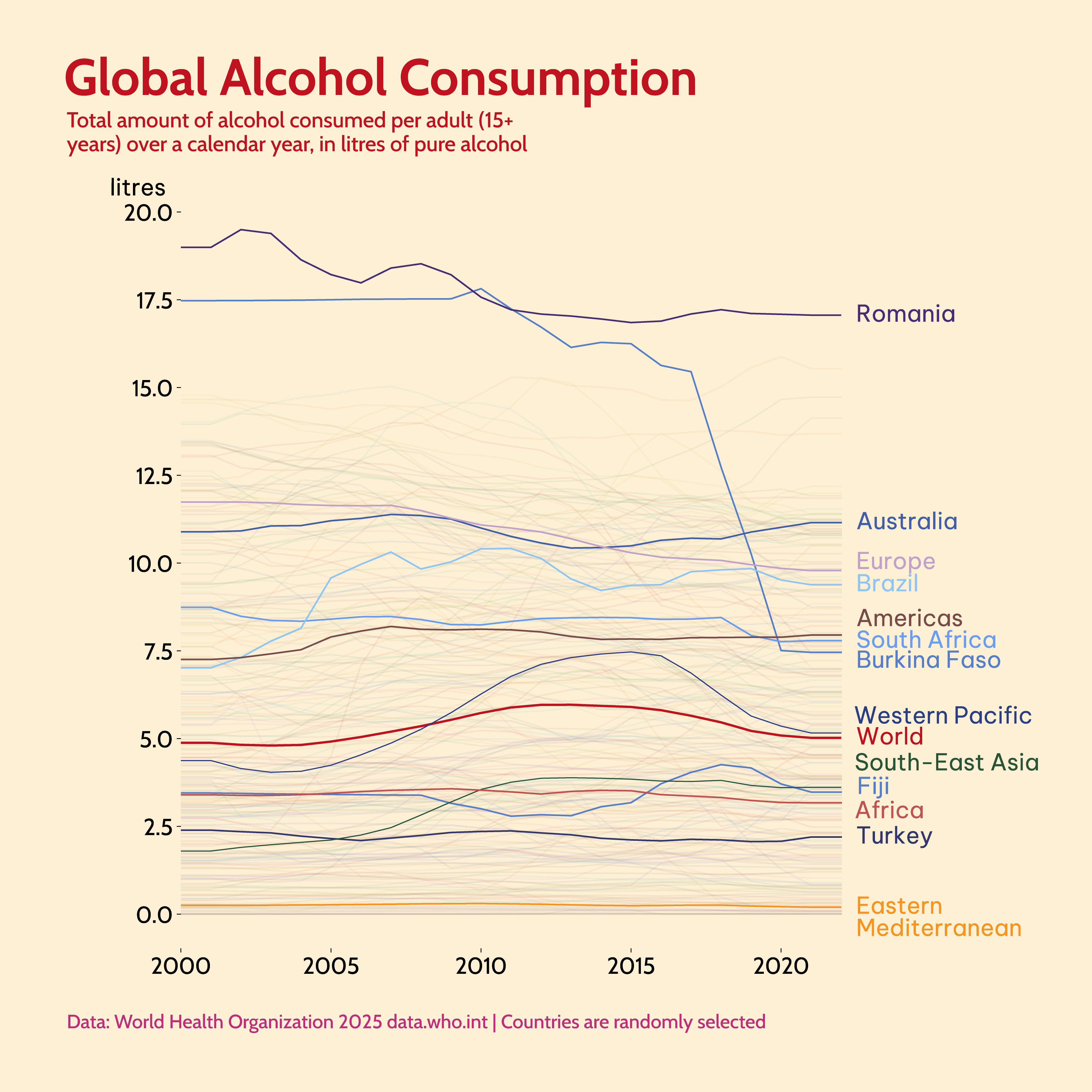 Consumption of alcohol trends are shifting worldwide, reflecting changing public health policies and economic realities. Using data compiled by the WHO, this line chart tracks the total alcohol consumption per adult over two decades, showcasing a comparison of different countries and WHO regions, and identifying which populations are consuming the most (what is going on in Romania?).