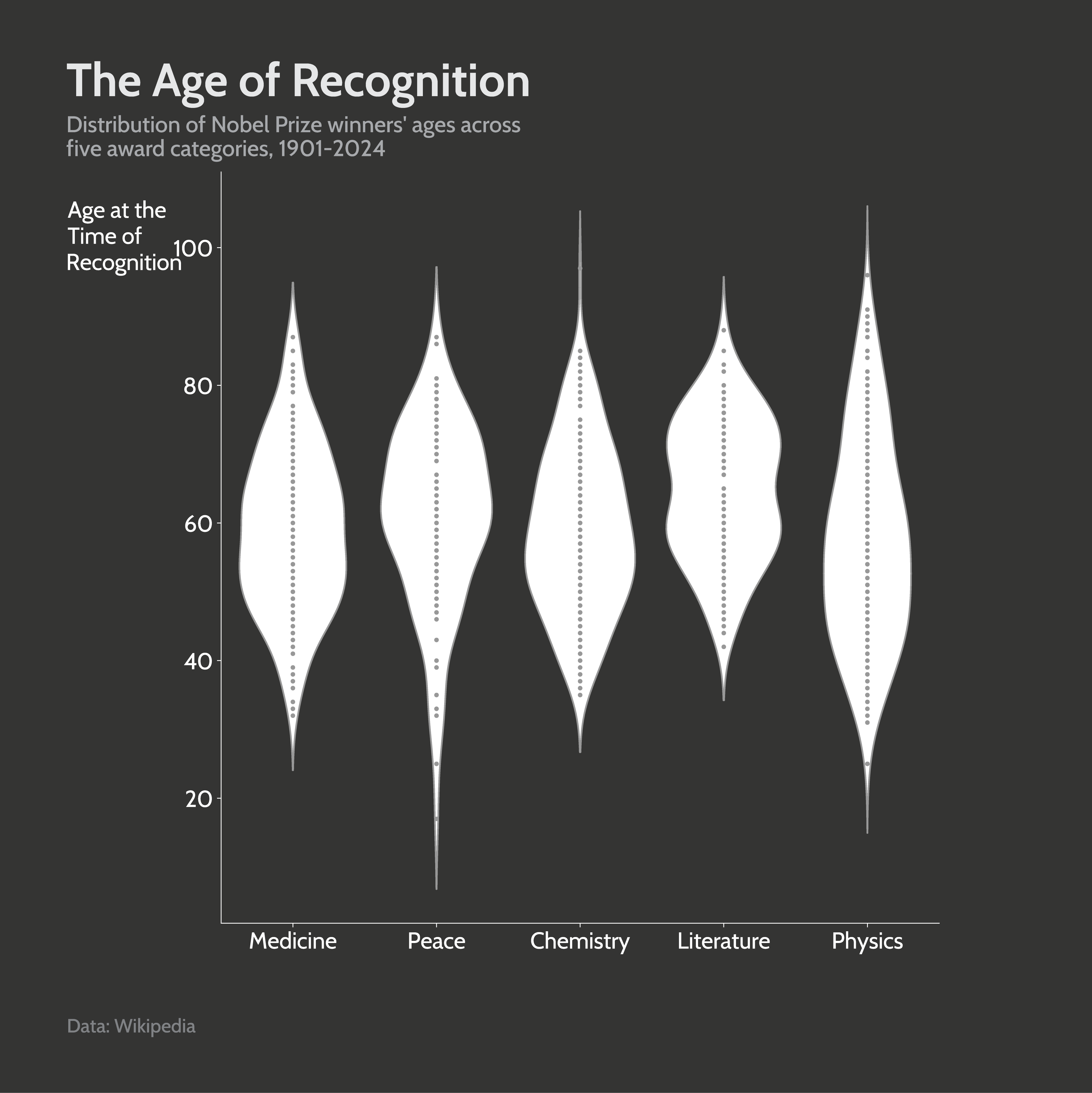 Does genius have an age limit? Explore the distribution of ages at which Nobel Prize winners received their recognition across five major categories, and if you still haven’t received yours, don’t worry some received their Nobel after their death. (I used a Violin Chart to highlight that it is the worst type of data visualisation)