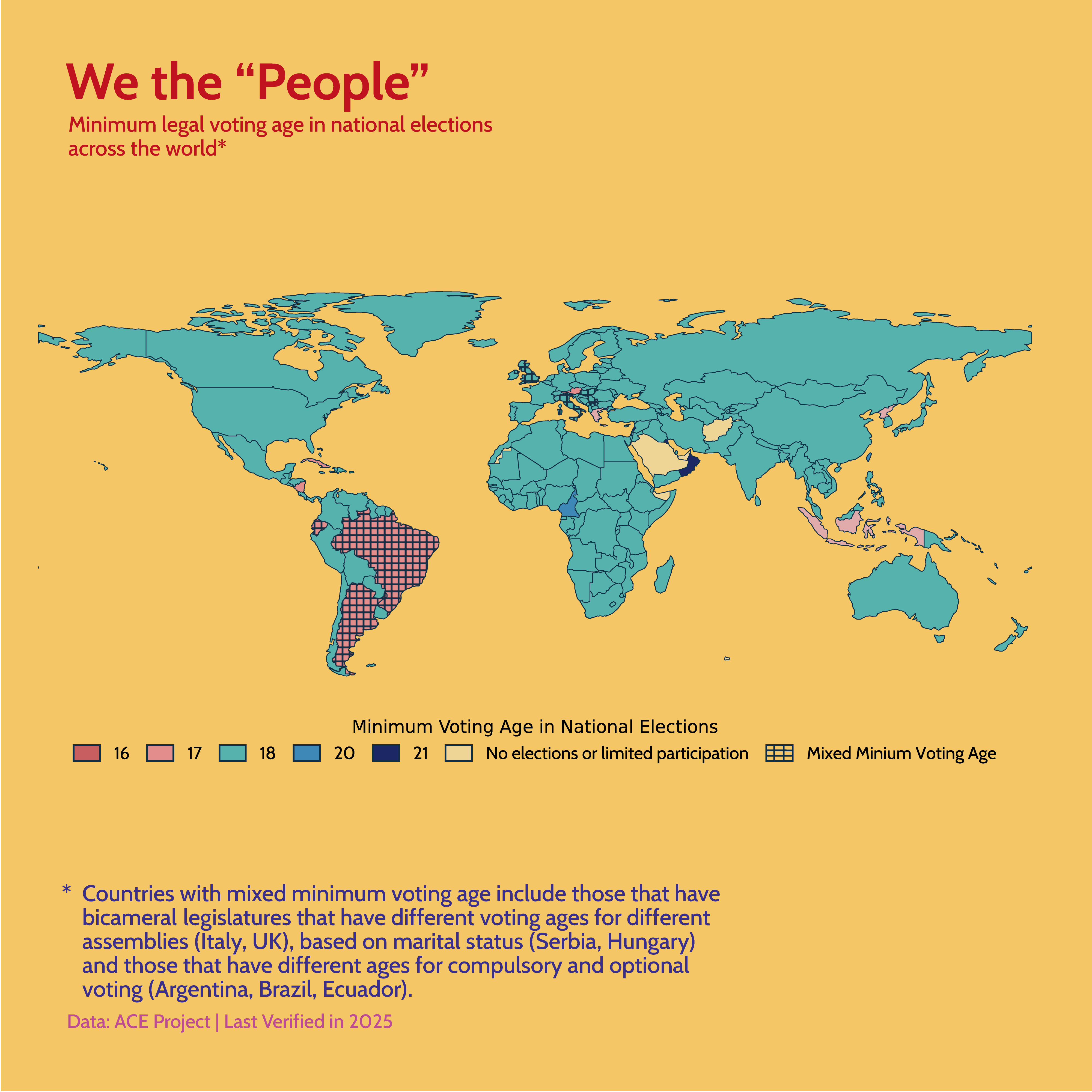 The definition of who is included as “the people” changes among different political systems. This world map visualises the minimum legal voting age for national elections across different countries. It highlights the political choice nations make in determining the age of consent for governance, with most of the world choosing age 18.