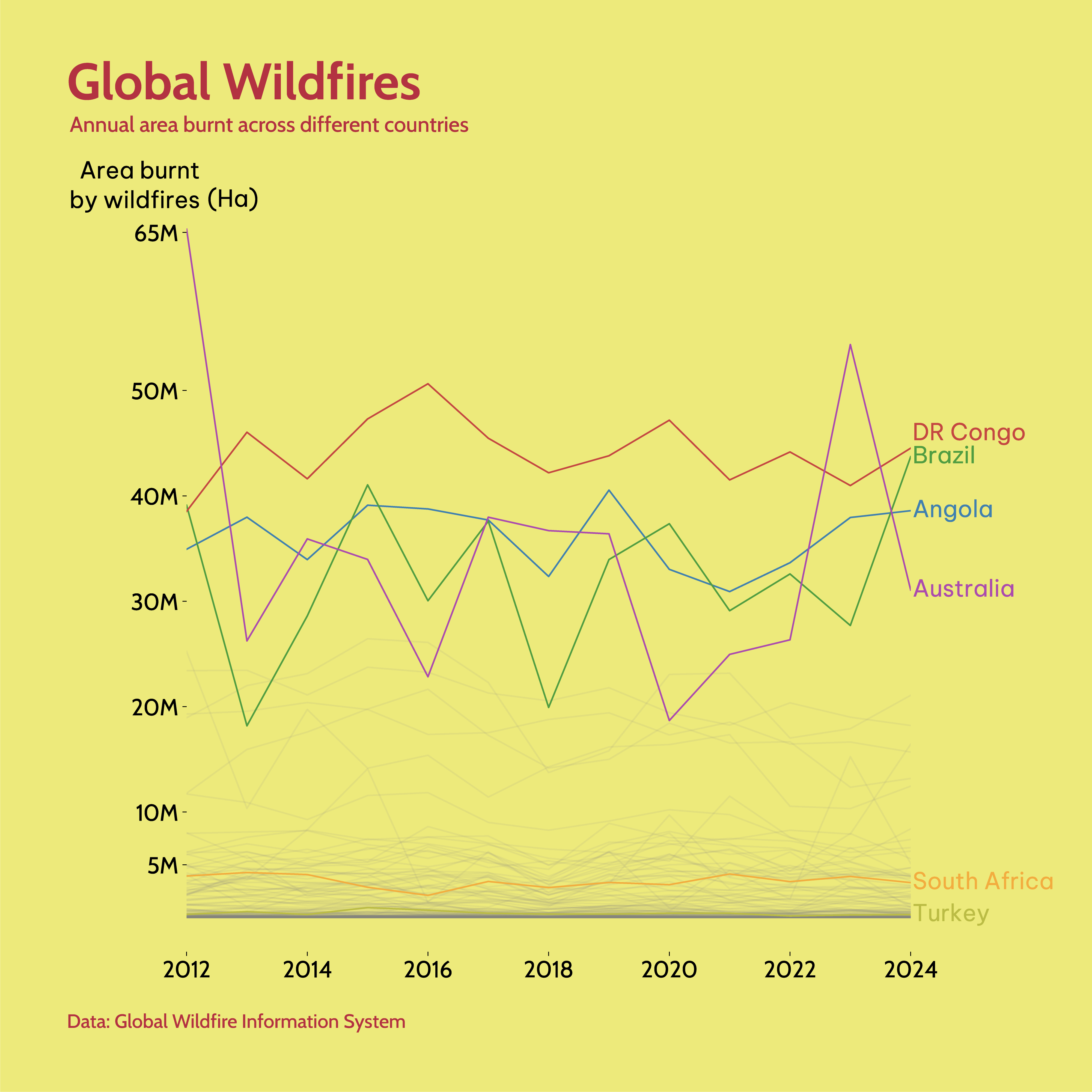 Fires have a vast impact globally. This chart tracks the annual area burnt by wildfires in select countries over a decade, revealing fluctuating trends across the globe.