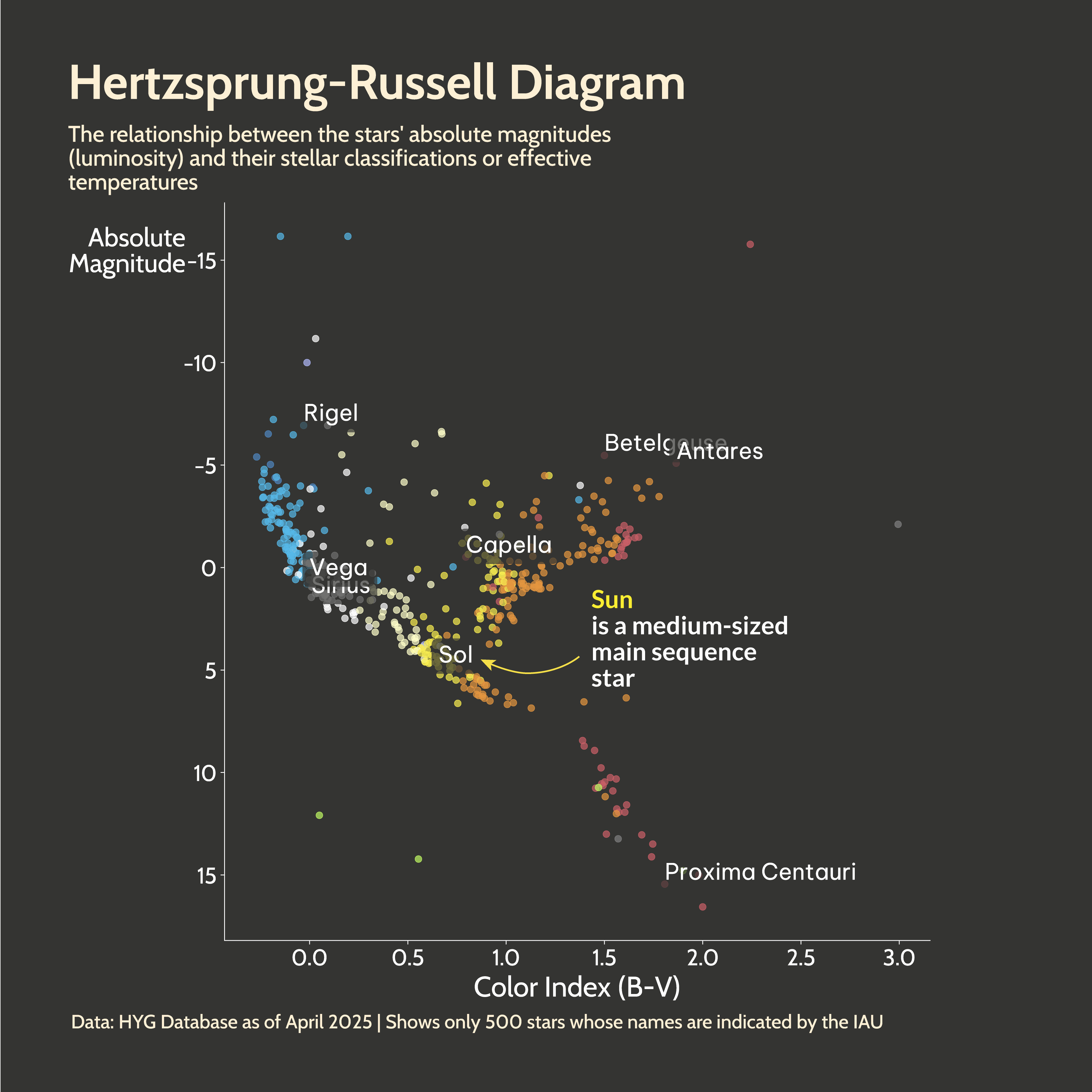 The Hertzsprung-Russell Diagram is arguably one of the the most important tools in astrophysics. It allows us to map the life cycle of every star in the galaxy based on its temperature (colour) and brightness (luminosity). The vast majority of stars (including our own Sun) fall along the diagonal ‘Main Sequence’ line, proving the power of data visualisation to uncover universal physical laws.