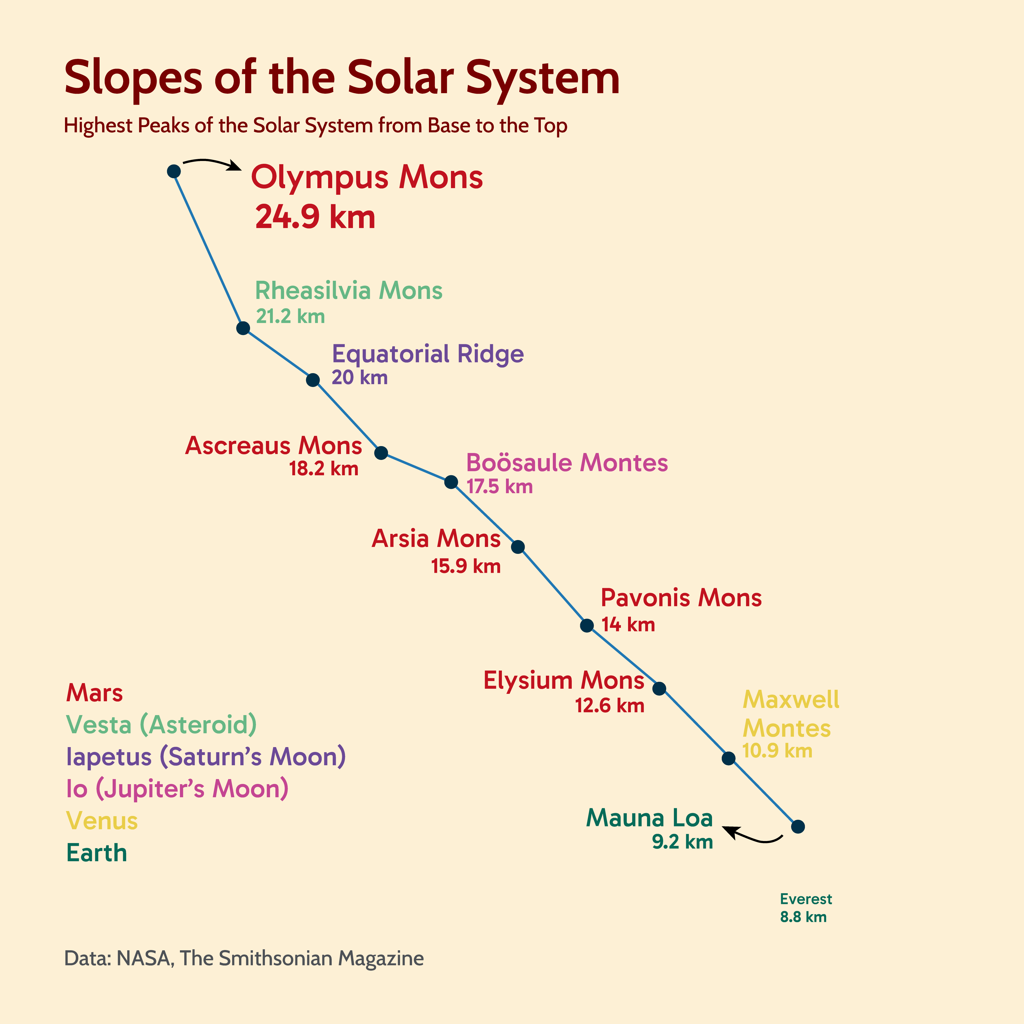 Our home planet’s mountains are miniatures compared to others in the Solar System. The highest peak in our Solar System, Olympus Mons, is more than three times higher than Mount Everest. Yet, if you were standing on top of the Martian giant, its immense base (which is roughly the size of France) would be invisible, lying far beyond the curvature of Mars.