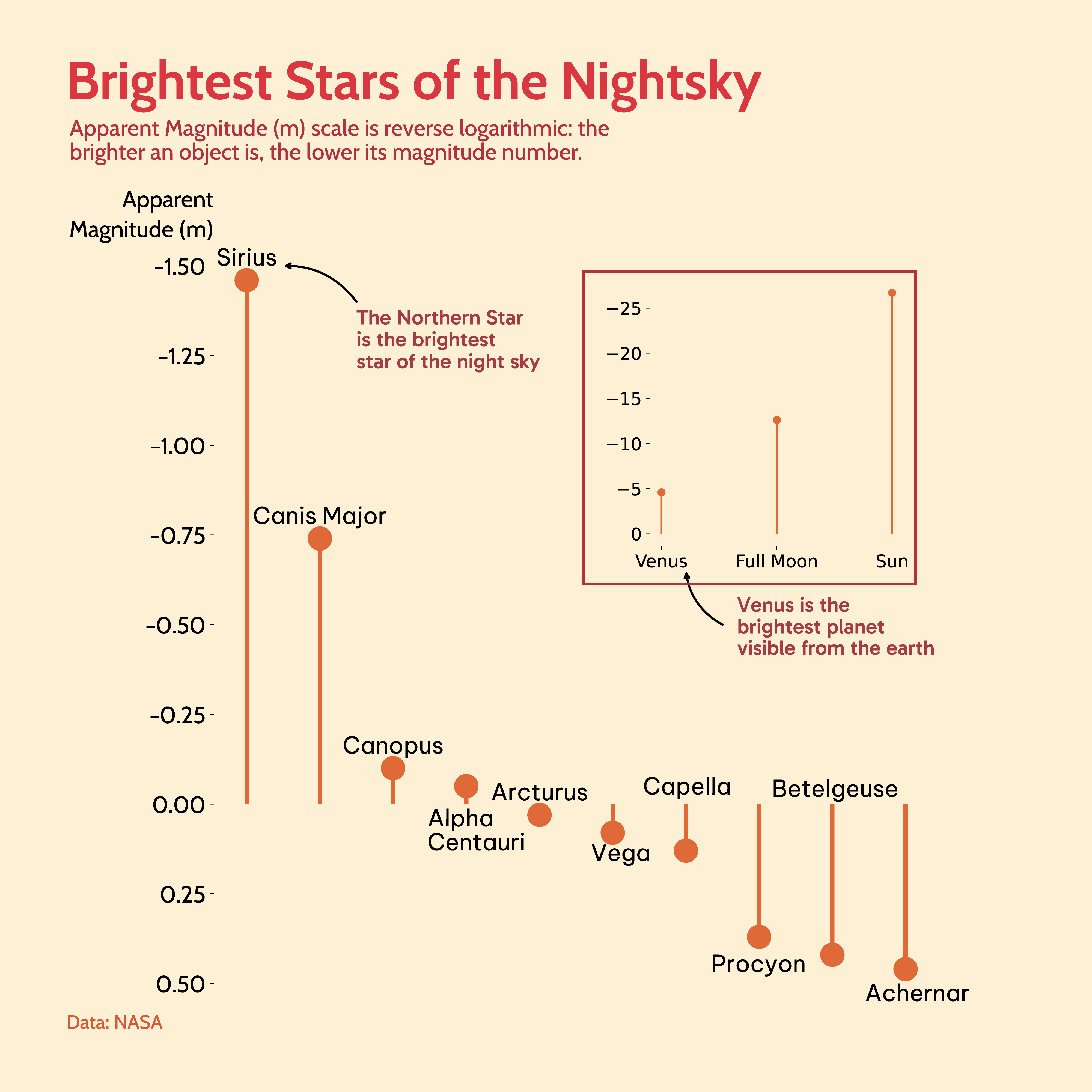 On a clear night with little light pollution, we see stars with varying brightness, sizes and colours. Apparent Magnitude measures this brightness. It’s a reverse logarithmic scale where lower numbers mean greater light. This chart ranks the brightest objects, revealing the true luminosity of nearby stellar giants like Sirius.