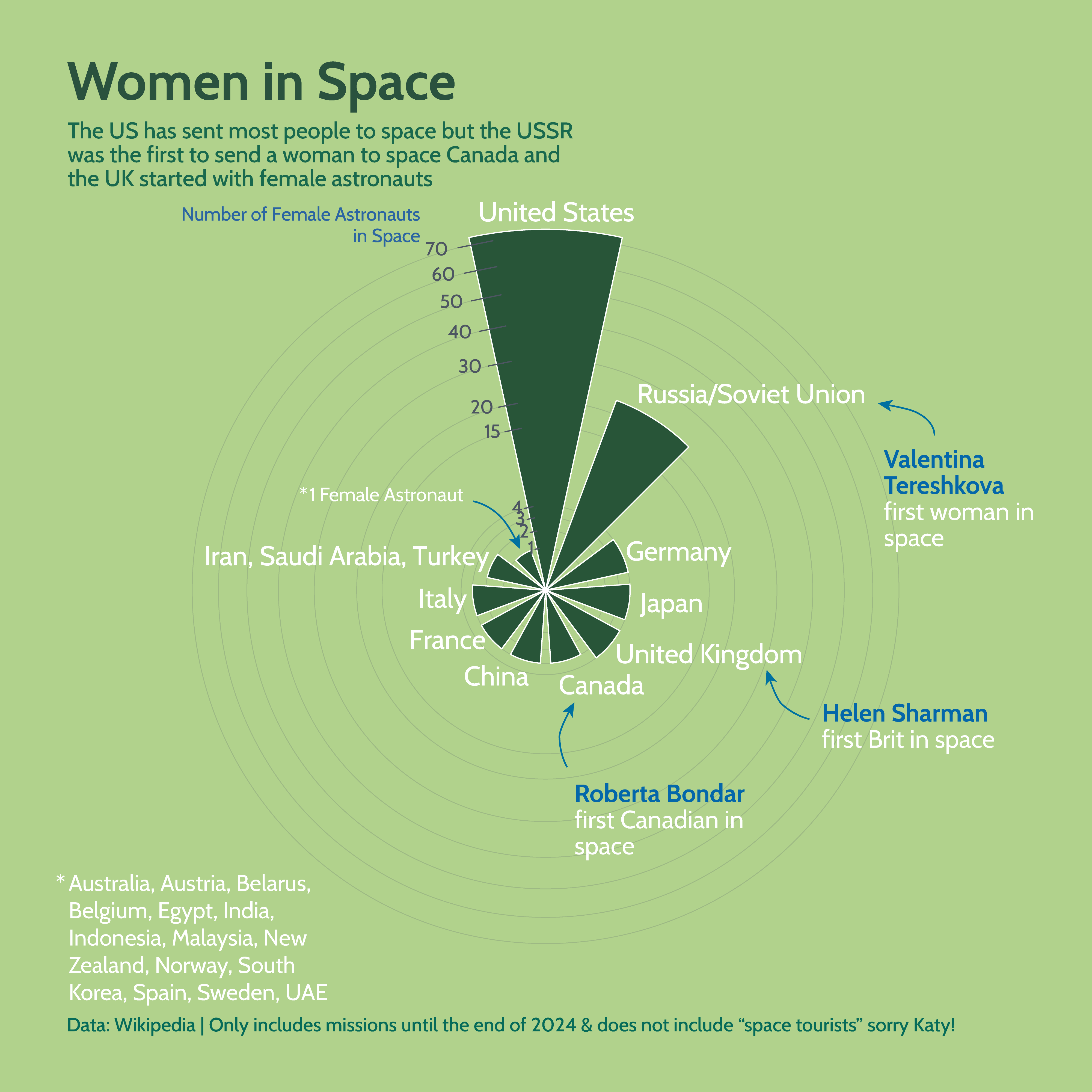 This Nightingale chart focuses on the women who have broken the ceiling and reached orbit, comparing the contributions of different countries to this epic (and ongoing) journey.
