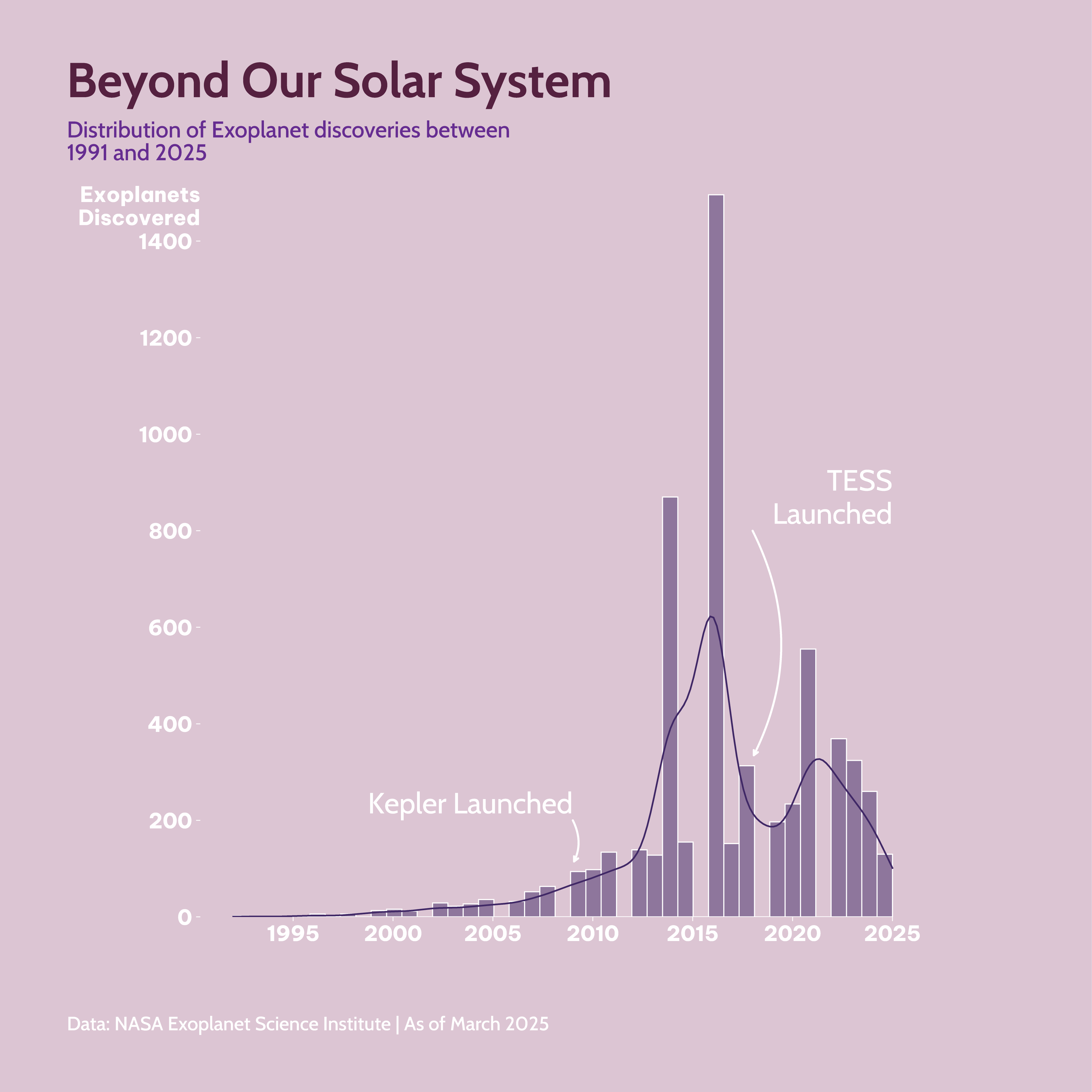 Exoplanets: planets orbiting distant stars were once only a prediction. Since the first confirmed exoplanet in the early 1990s, we have now verified more than 5,000, thanks to dedicated ground and space-based telescopes hunting for new exoplanets. This histogram captures the explosive rate of discovery, showing exactly when missions like Kepler and TESS turned a trickle of data into a galactic flood.